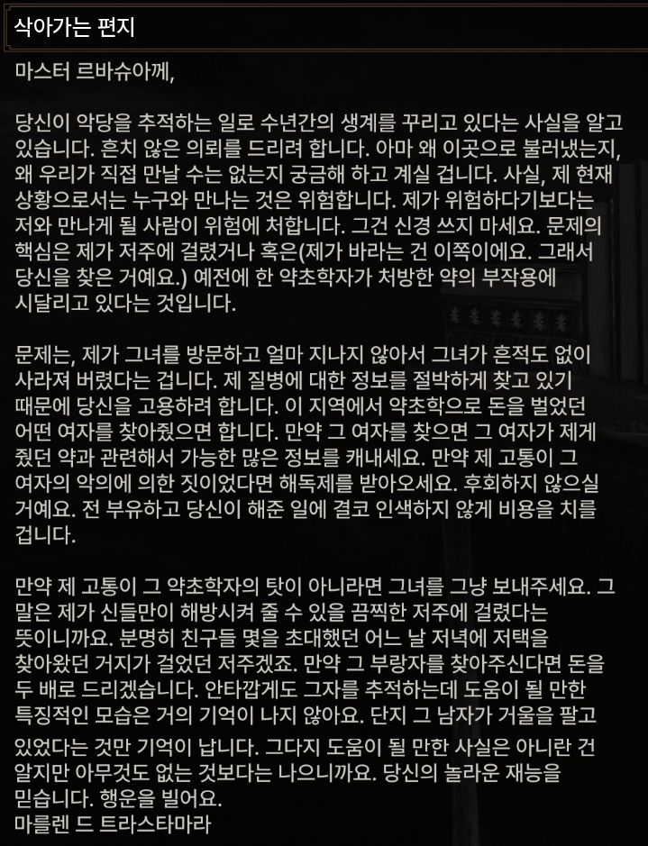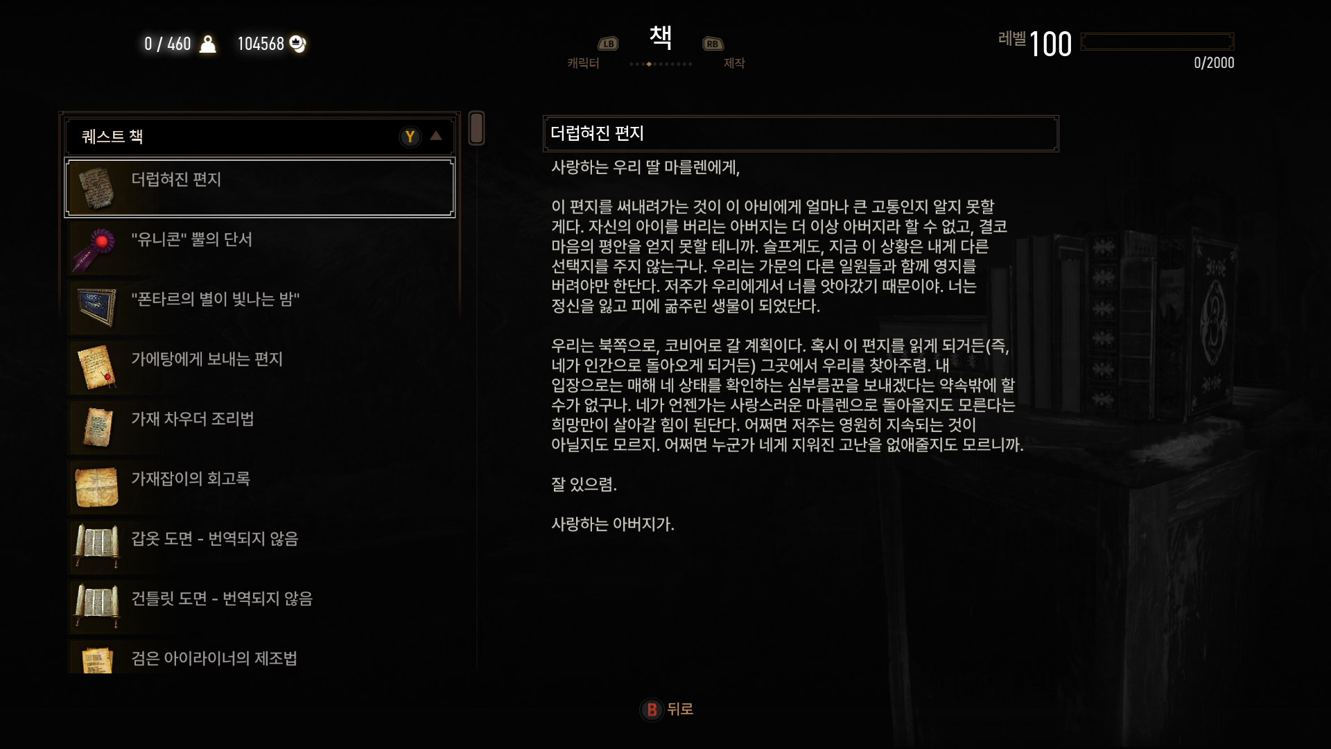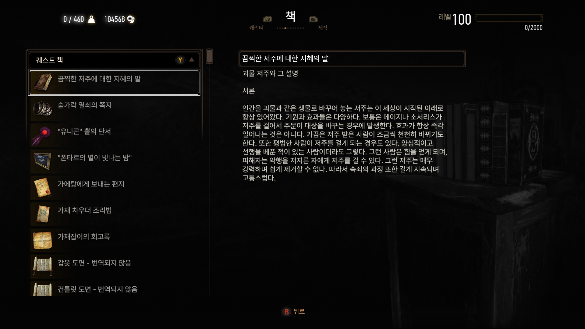 위쳐3 마를렌과 군터오딤 2023.12.03 10:48 내 삶의 공간/취미 공간 위 내용들을 살펴보면 군터오딤이 마를렌한테 저주를 걸었다는 사실을 알 수 있습니다 공유하기 게시글 관리 Rsha의 게임 공략 블로그 '내 삶의 공간 > 취미 공간' 카테고리의 다른 글 DLC Names from the Path 한글 번역 중 (0) 2023.11.22 디아2 움짤 (2) 2022.06.06 스카이림LE 스샷들 (0) 2021.07.23 오랜만에 스카이림LE 스샷 (0) 2021.07.05 레데리2 스샷 (0) 2020.04.21 댓글 공유하기 다른 글 댓글 이 글 공유하기 구독하기 구독하기 카카오톡 카카오톡 라인 라인 트위터 트위터 Facebook Facebook 카카오스토리 카카오스토리 밴드 밴드 네이버 블로그 네이버 블로그 Pocket Pocket Evernote Evernote 다른 글 DLC Names from the Path 한글 번역 중 DLC Names from the Path 한글 번역 중 2023.11.22 디아2 움짤 디아2 움짤 2022.06.06 스카이림LE 스샷들 스카이림LE 스샷들 2021.07.23 오랜만에 스카이림LE 스샷 오랜만에 스카이림LE 스샷 2021.07.05 다른 글 더 둘러보기